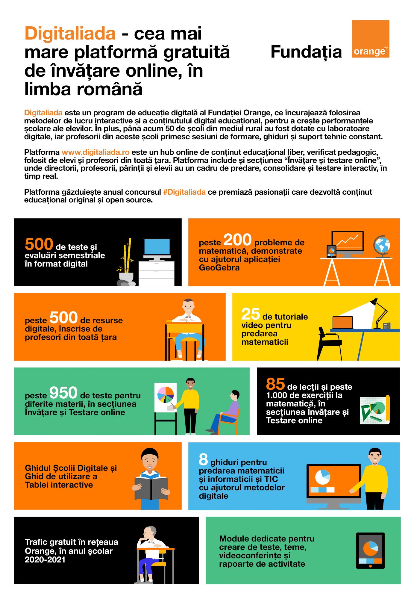 Pentru a veni și mai mult în sprijinul învățării online, clienții Orange beneficiază de trafic de date gratuit, pe tot parcursul anului școlar 2020-2021, la accesarea platformei interactive „Învățare și testare online”, dar și a celor peste 2000 de resurse educaționale din www.digitaliada.ro.